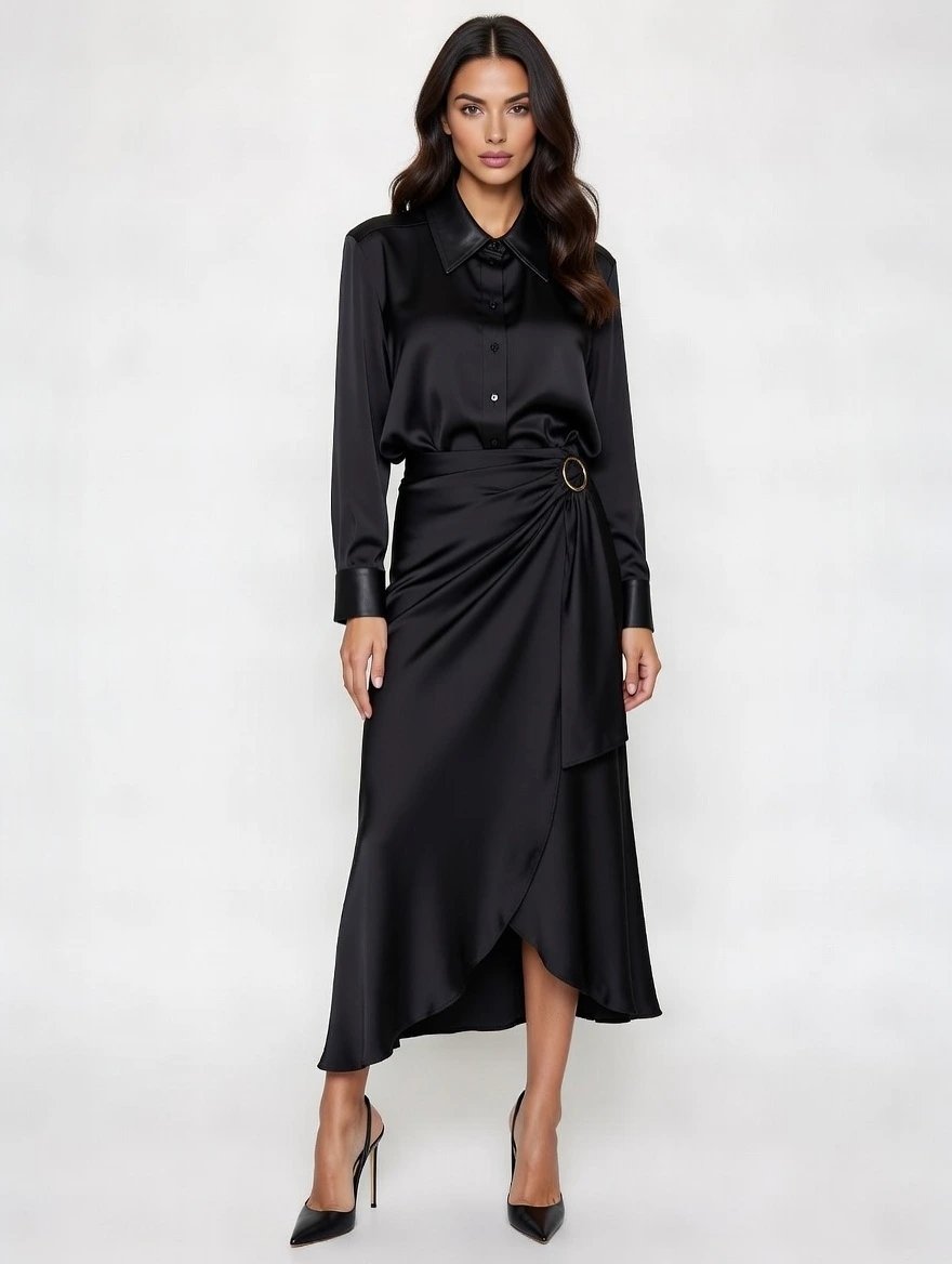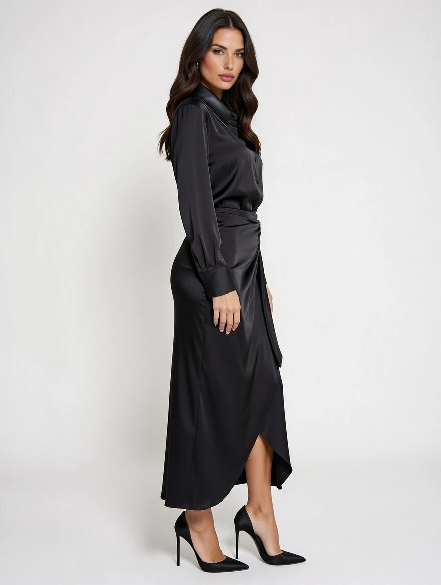 This elegant black draped midi dress combines classic sophistication with contemporary fashion. Designed with a stylish draped silhouette, this dress creates a flattering and graceful shape that enhances your natural look.