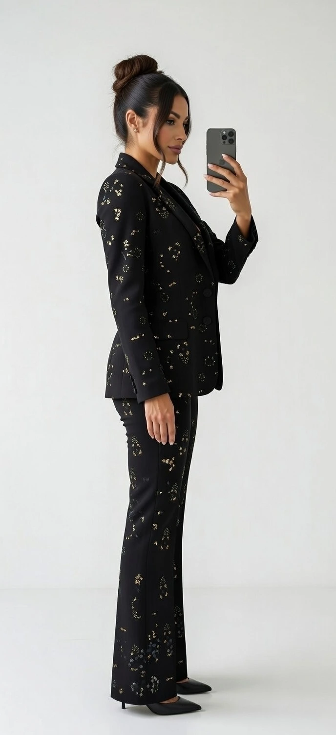 Pair this suit with black heels and minimal gold jewelry for a refined evening look.