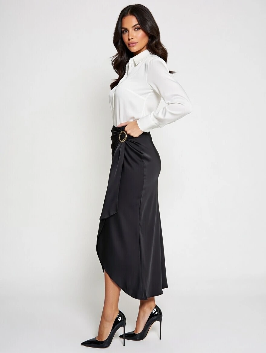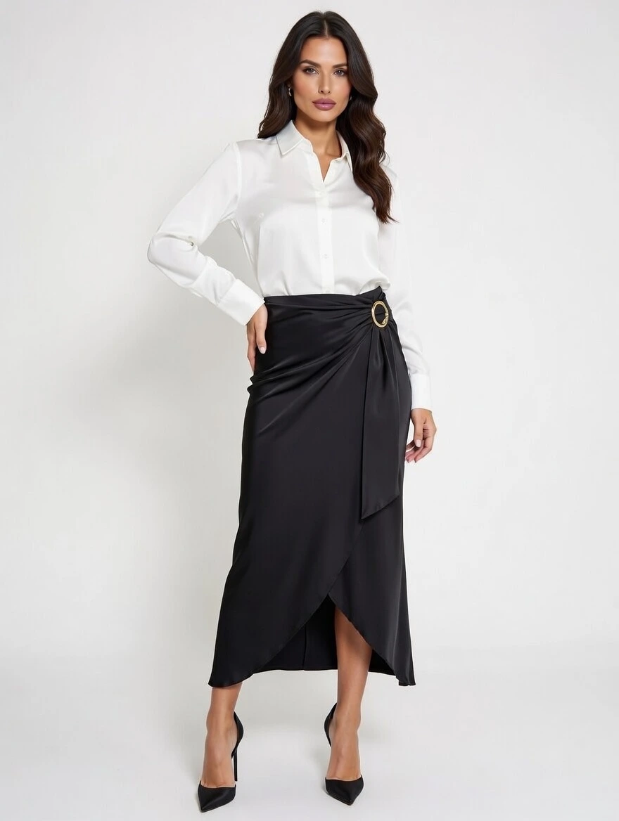 This elegant outfit combines a classic white blouse with a stylish black wrap midi skirt, creating a timeless and versatile look perfect for both professional and social settings.