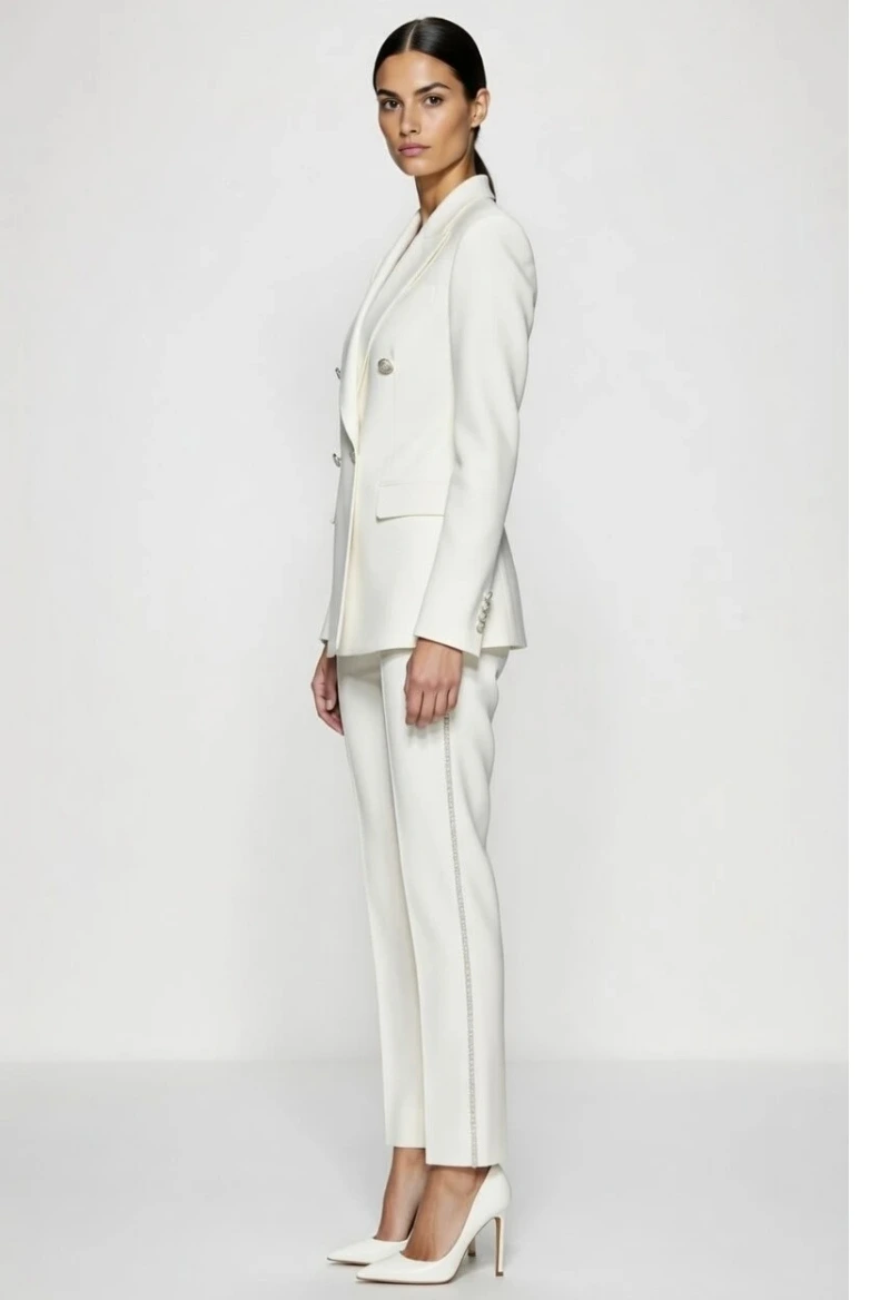 The blazer features a structured double-breasted design with a sharp lapel collar, giving it a powerful and elegant aesthetic. Its tailored fit provides a flattering shape while maintaining comfort and freedom of movement. Paired with matching slim-fit trousers, the outfit creates a cohesive and stylish ensemble suitable for multiple occasions.
